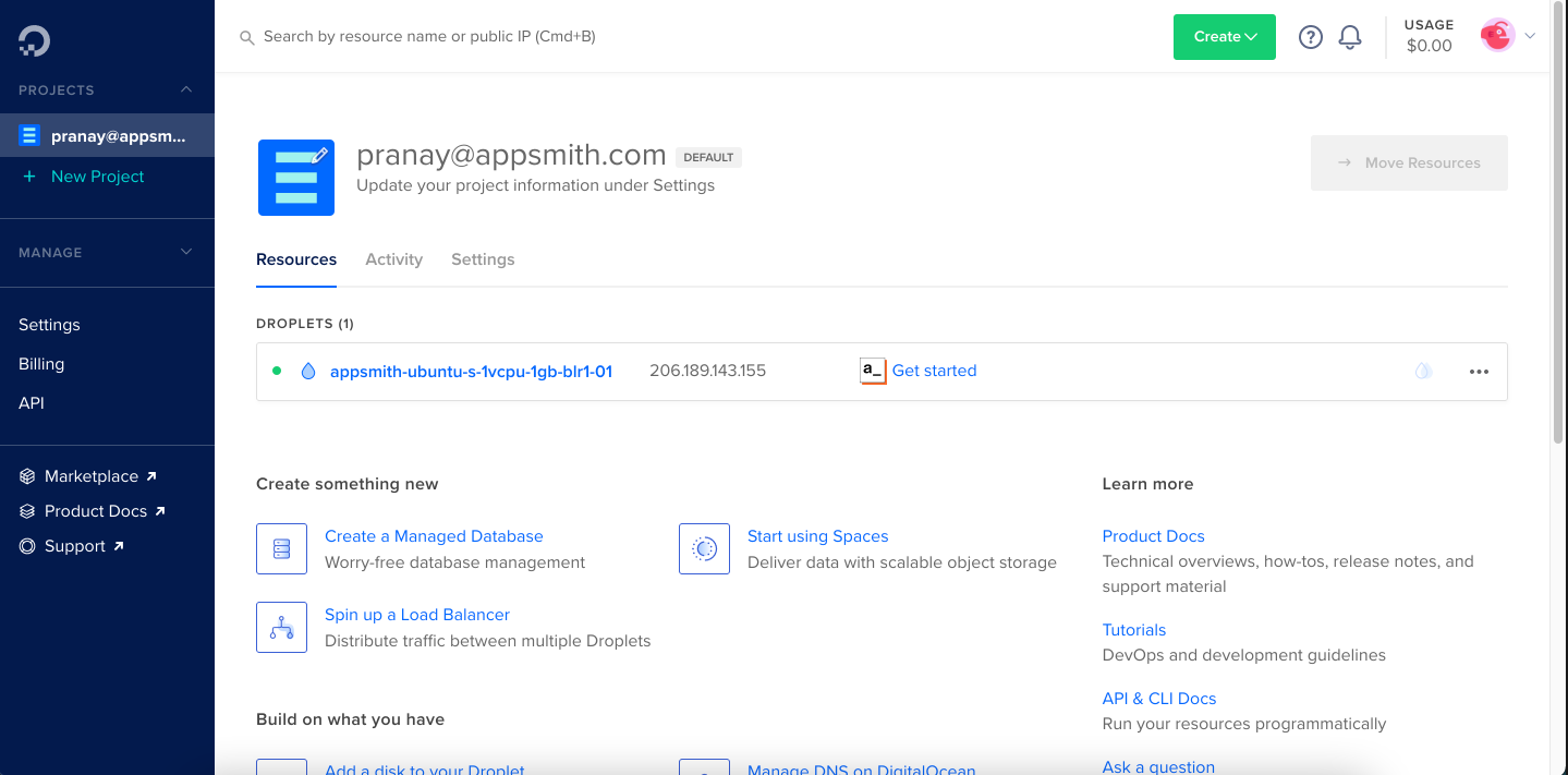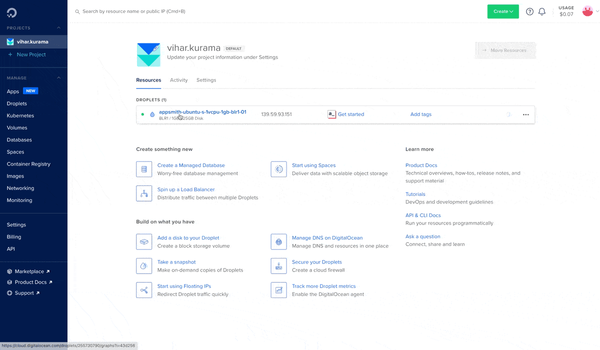 It takes a few minutes (approximately 3-4 minutes) to install Appsmith on the DigitalOcean droplet. You’ll find the deployed droplet on your dashboard with all the details of the selected configuration.