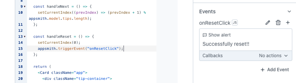 Example: To trigger an event from the custom widget upon a button click, create a new event named onResetClick and add the following in the JavaScript code: